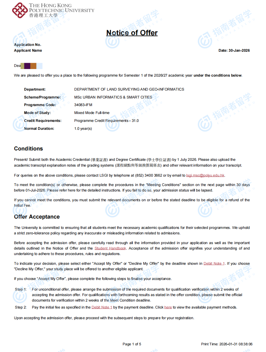 香港理工大學(xué)城市信息學(xué)及智慧城市理學(xué)碩士研究生offer一枚