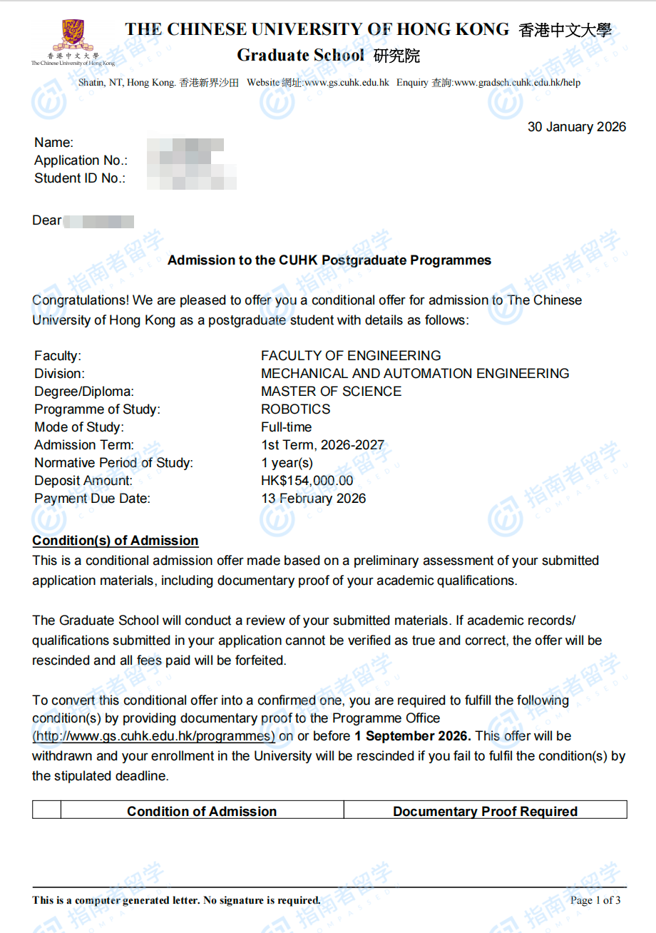 香港中文大學(xué)機(jī)器人學(xué)理學(xué)碩士研究生offer一枚
