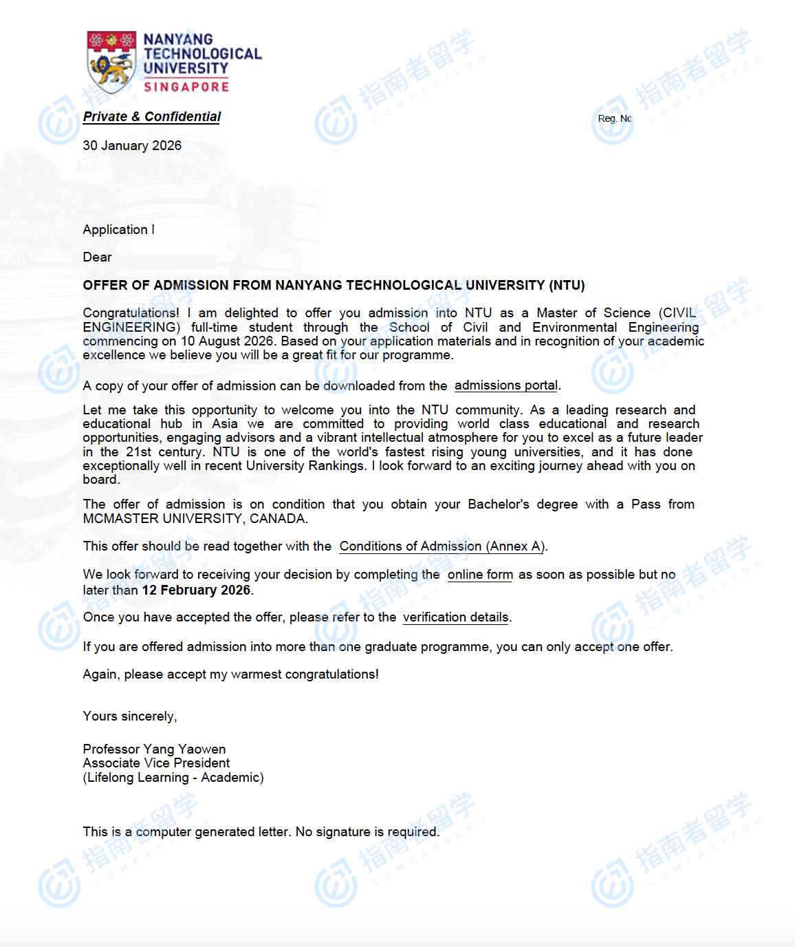 南洋理工大學土木工程理學碩士研究生offer一枚
