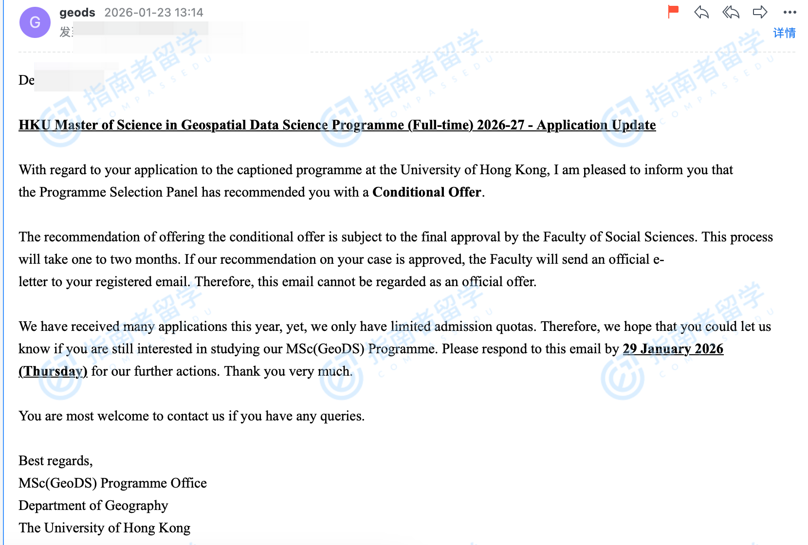 香港大學(xué)地理空間數(shù)據(jù)科學(xué)理學(xué)碩士研究生offer一枚