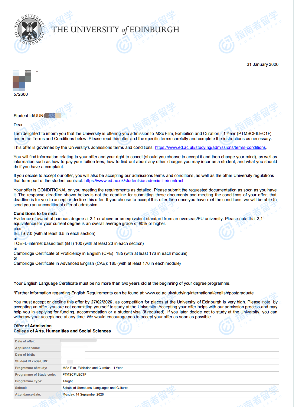愛丁堡大學(xué)媒介間性:文學(xué)、電影與對(duì)話中的藝術(shù)理學(xué)碩士研究生offer一枚