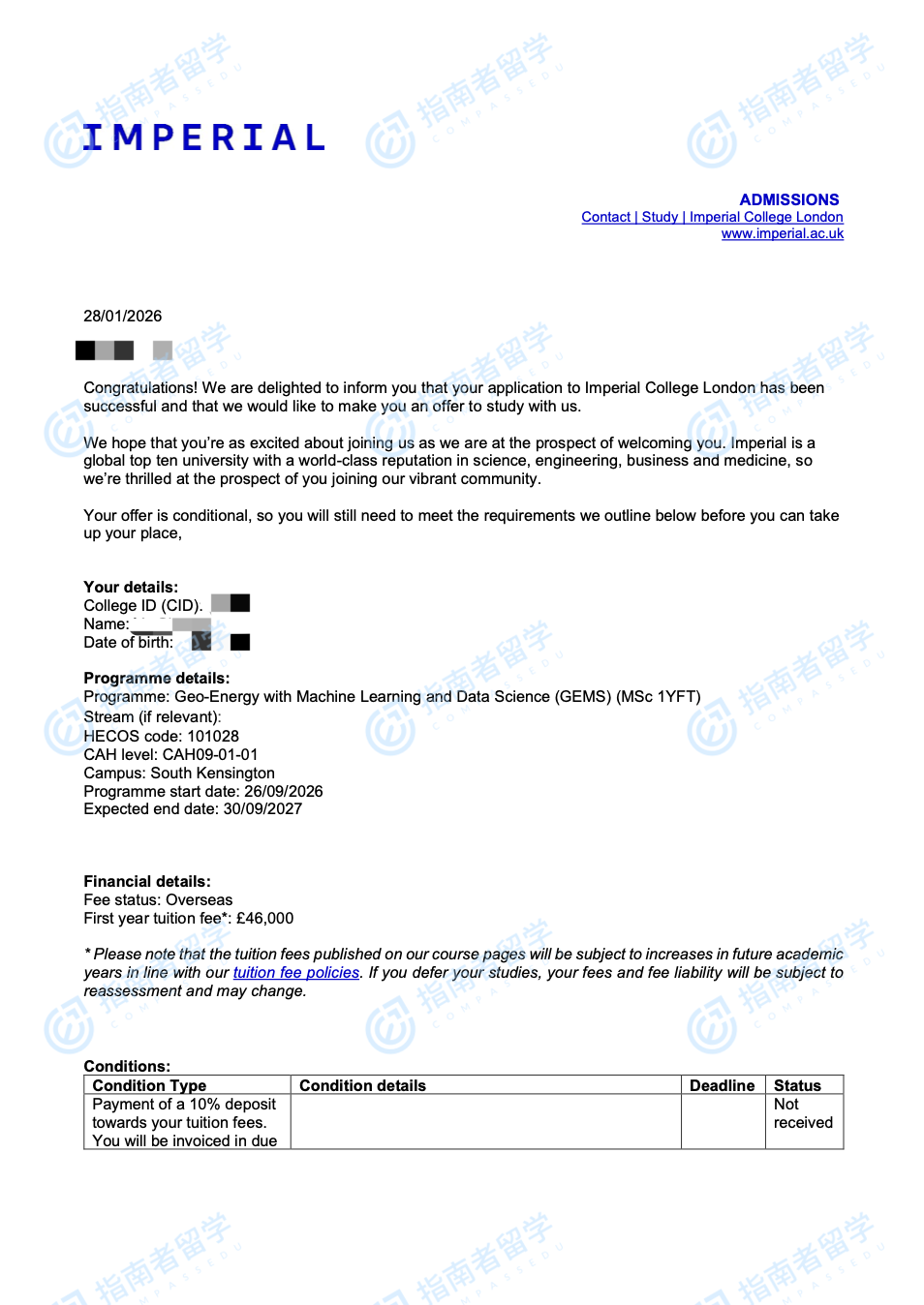 帝國理工學(xué)院地球能源(機器學(xué)習(xí)與數(shù)據(jù)科學(xué))理學(xué)碩士研究生offer一枚