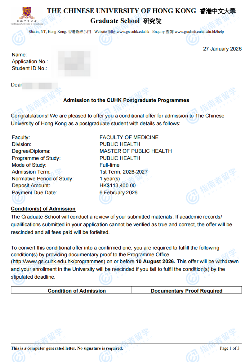 香港中文大學公共健康碩士研究生offer一枚