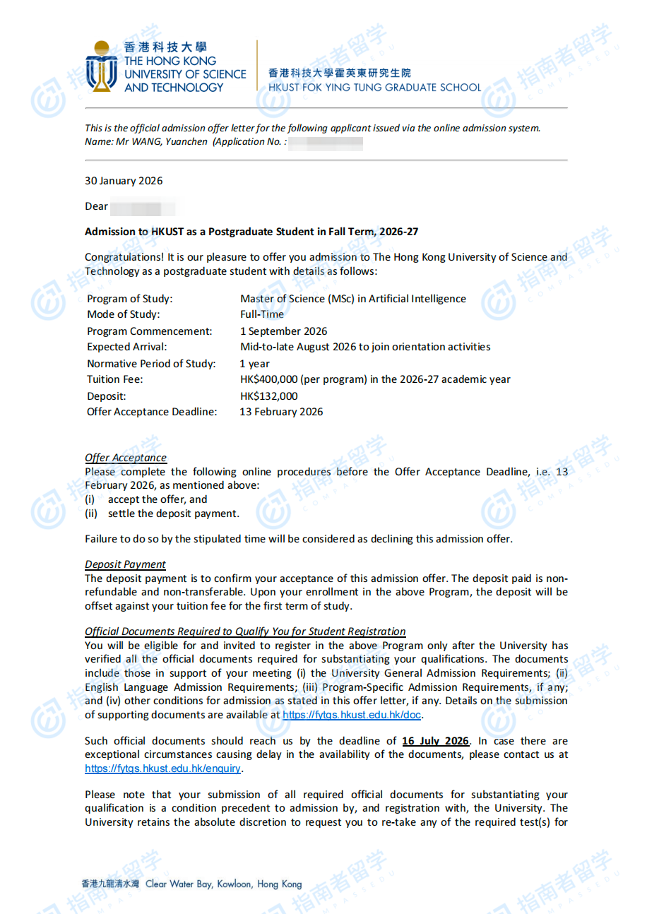 香港科技大學人工智能理學碩士研究生offer一枚
