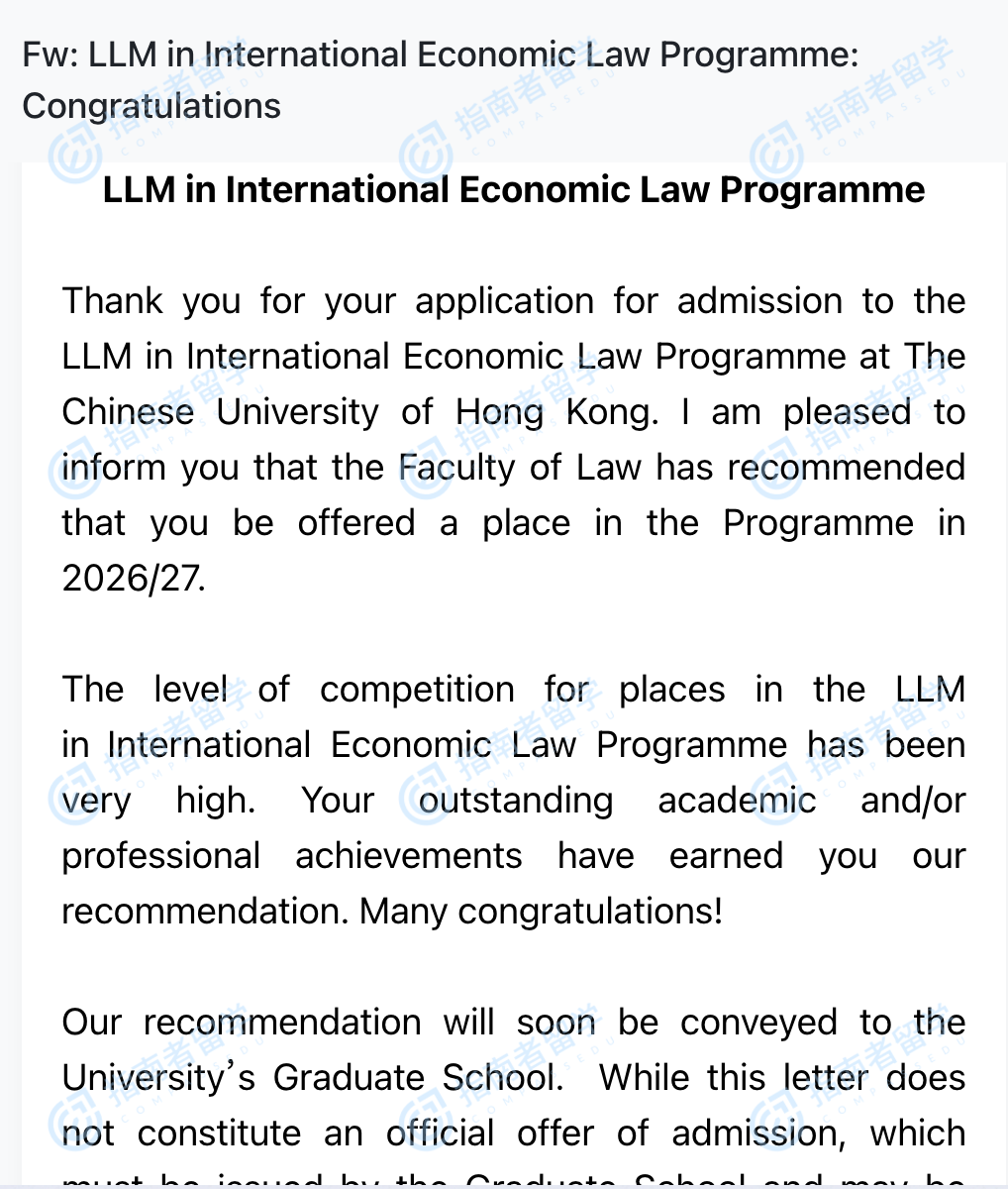 香港中文大學國際經(jīng)濟法法學碩士研究生offer一枚
