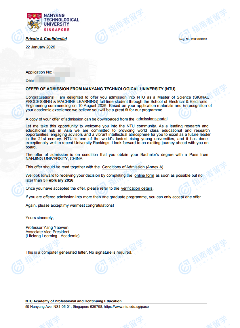 南洋理工大學(xué)信號(hào)處理和機(jī)器學(xué)習(xí)理學(xué)碩士研究生offer一枚