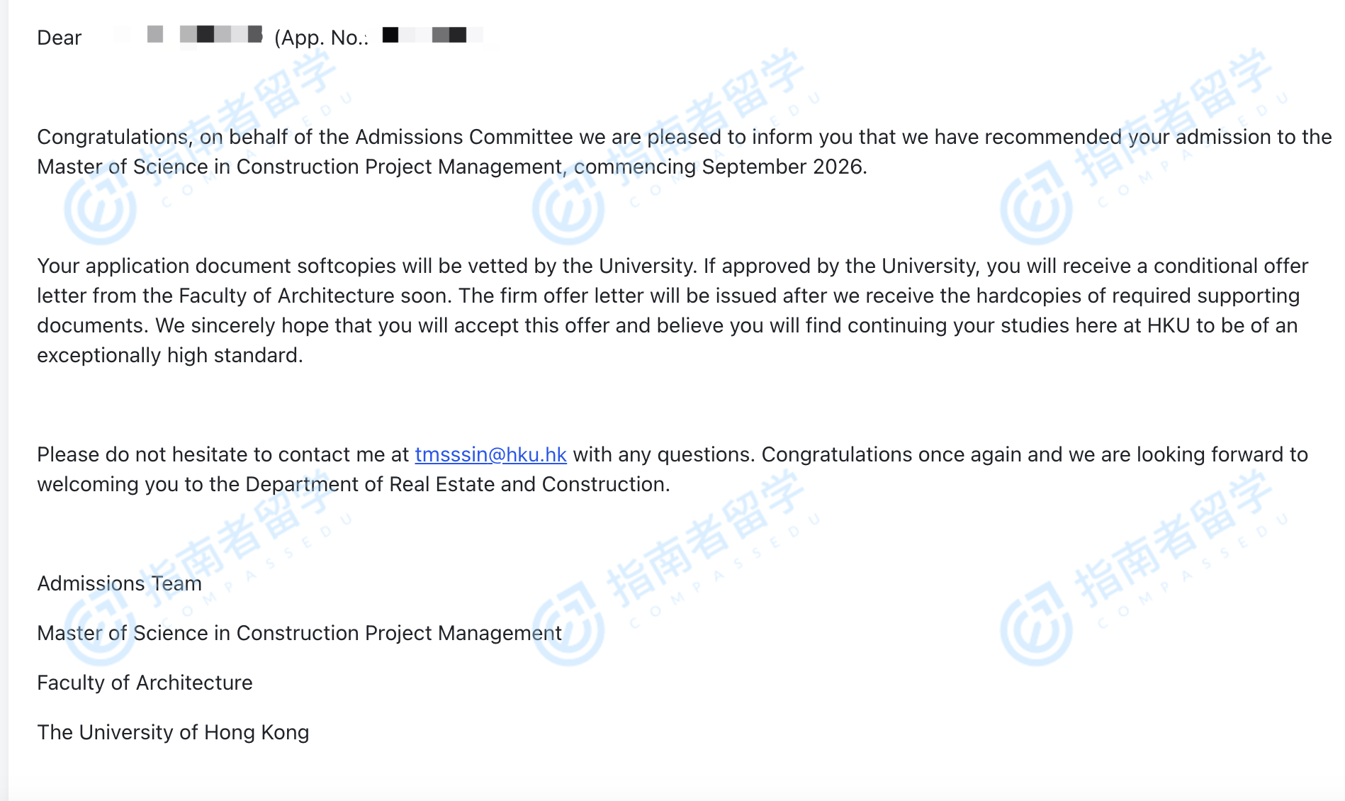 香港大學(xué)建筑項(xiàng)目管理理學(xué)碩士研究生offer一枚