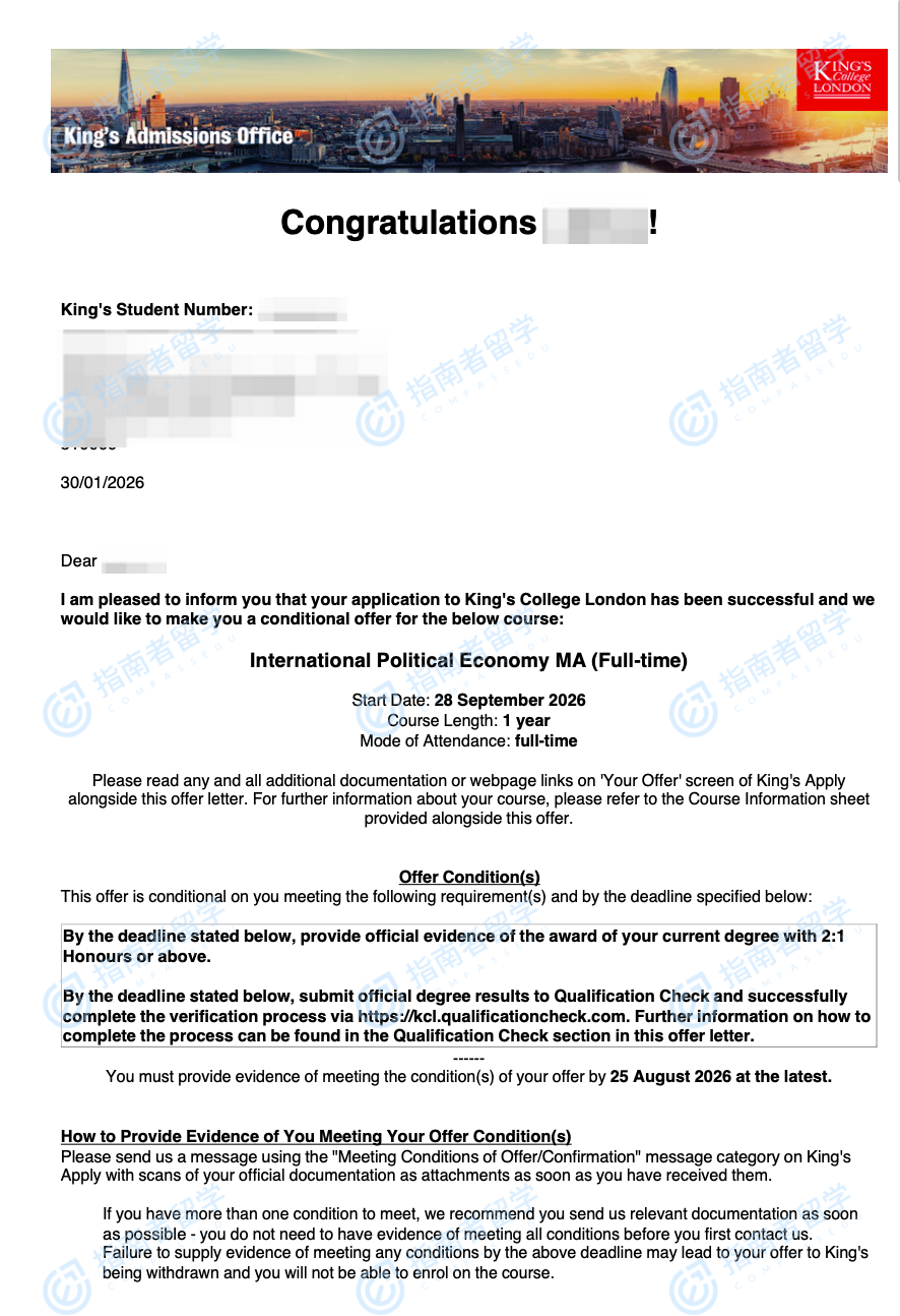 倫敦大學(xué)國王學(xué)院國際政治經(jīng)濟(jì)學(xué)文學(xué)碩士研究生offer一枚