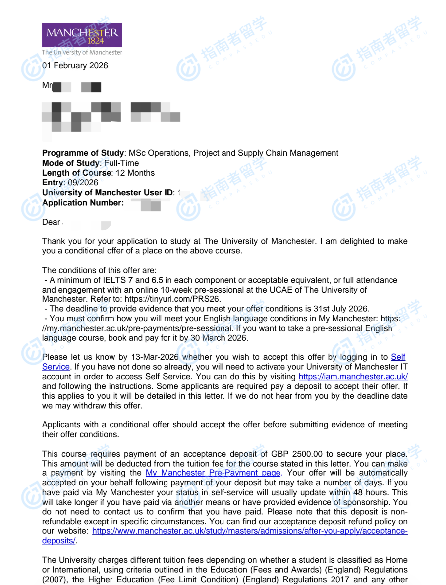 曼徹斯特大學運營、項目與供應鏈管理理學碩士研究生offer一枚