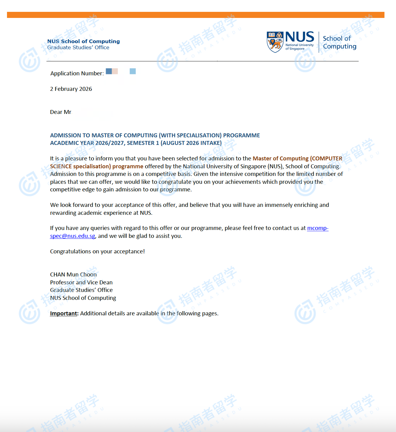 新加坡國立大學(xué)計算碩士(含細(xì)分方向)研究生offer一枚