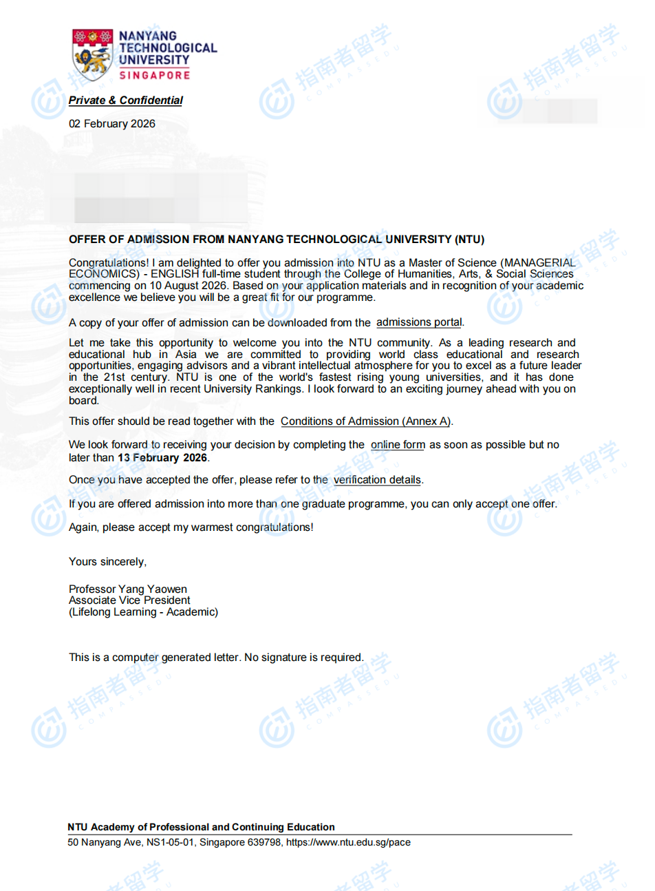 南洋理工大學(xué)管理經(jīng)濟學(xué)理學(xué)碩士(英文授課)研究生offer一枚