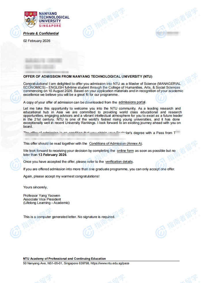 南洋理工大學(xué)管理經(jīng)濟學(xué)理學(xué)碩士(英文授課)研究生offer一枚