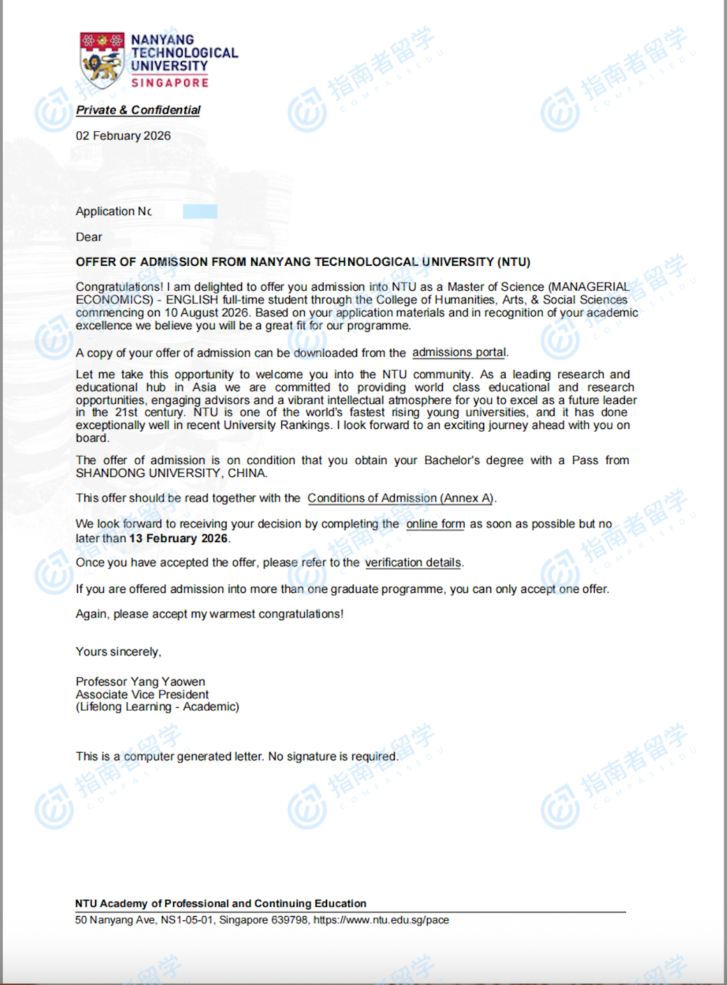 南洋理工大學管理經(jīng)濟學理學碩士(英文授課)研究生offer一枚
