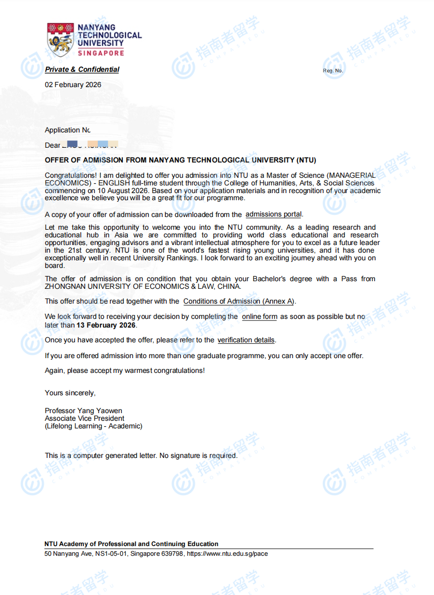 南洋理工大學(xué)管理經(jīng)濟(jì)學(xué)理學(xué)碩士(英文授課)研究生offer一枚