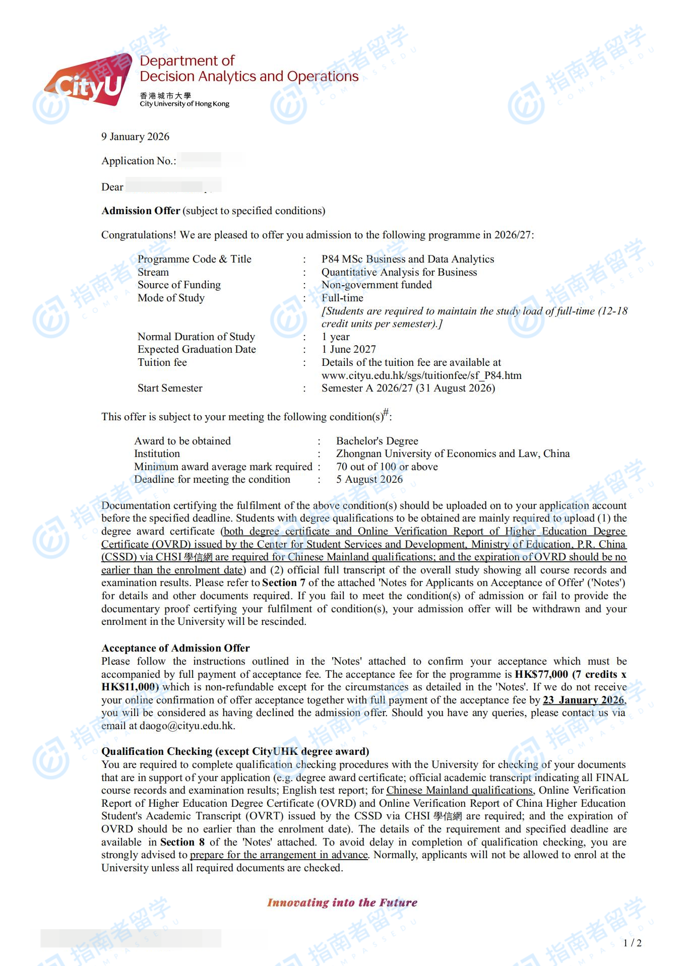 香港城市大學商業(yè)及數(shù)據(jù)分析理學碩士研究生offer一枚