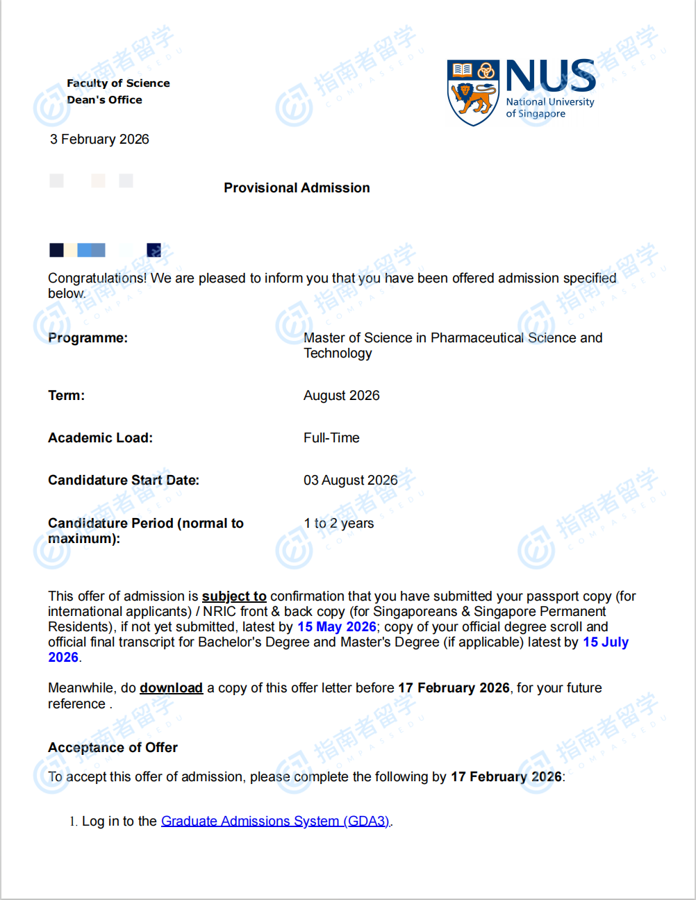 新加坡國(guó)立大學(xué)制藥科學(xué)與技術(shù)理學(xué)碩士研究生offer一枚