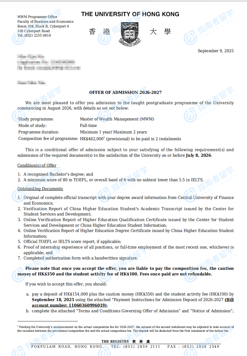 香港大學(xué)財(cái)富管理碩士研究生offer一枚