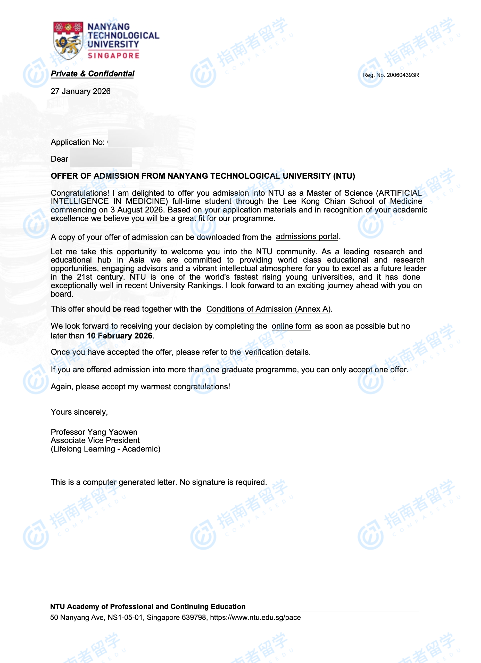南洋理工大學(xué)醫(yī)學(xué)人工智能理學(xué)碩士研究生offer一枚