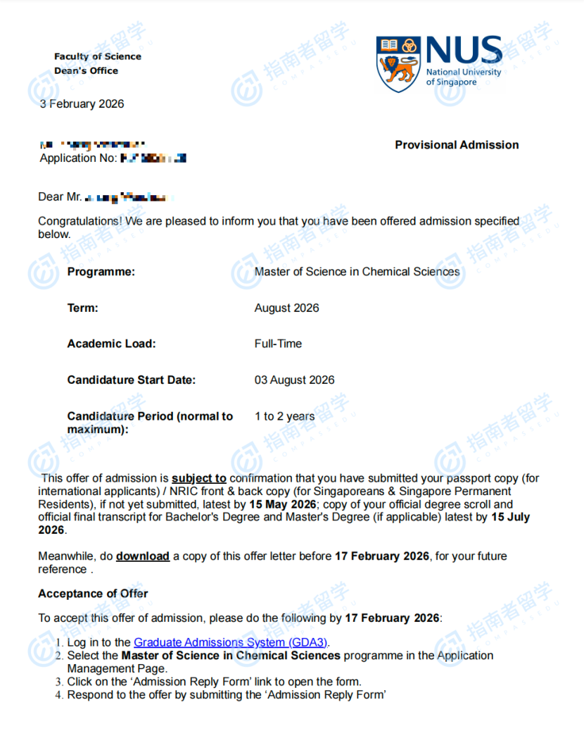 新加坡國(guó)立大學(xué)化學(xué)科學(xué)理學(xué)碩士研究生offer一枚