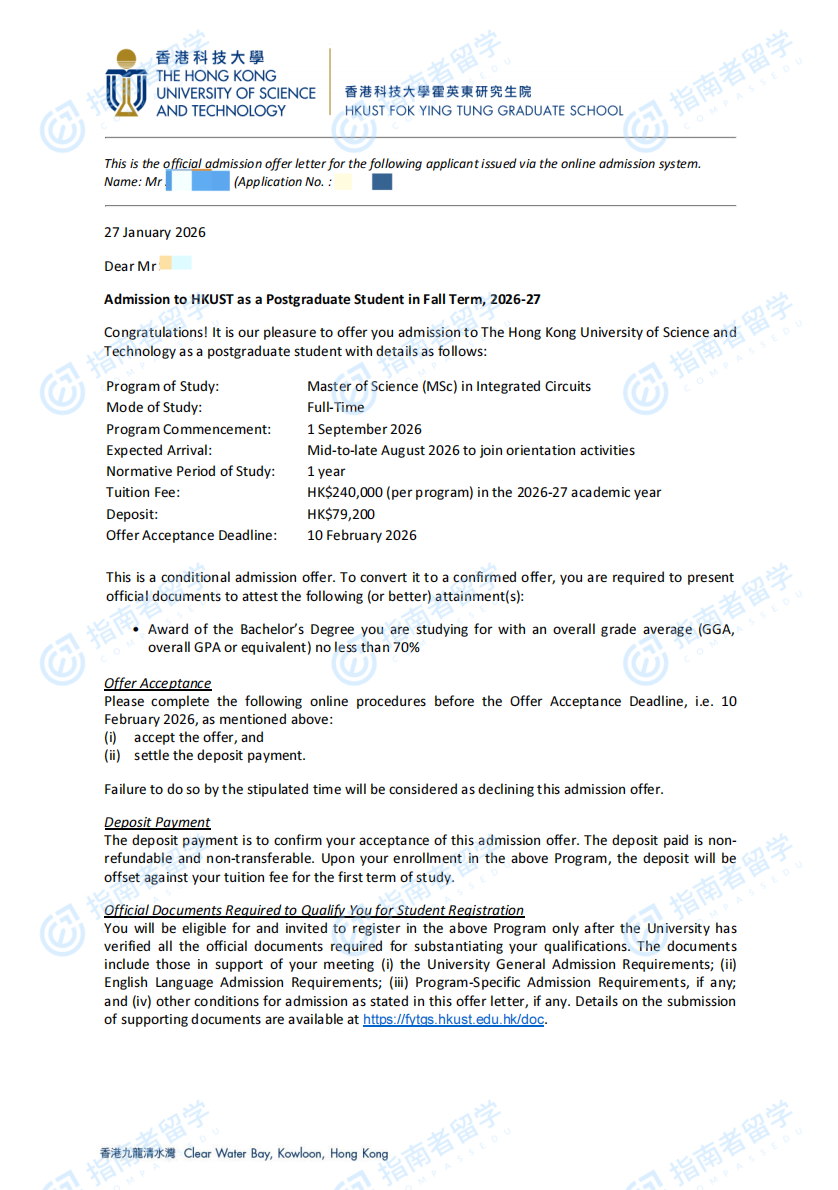 香港科技大學(xué)集成電路理學(xué)碩士研究生offer一枚