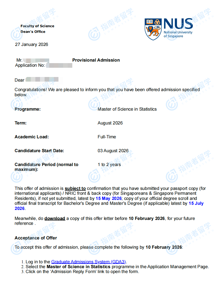 新加坡國(guó)立大學(xué)統(tǒng)計(jì)學(xué)理學(xué)碩士研究生offer一枚