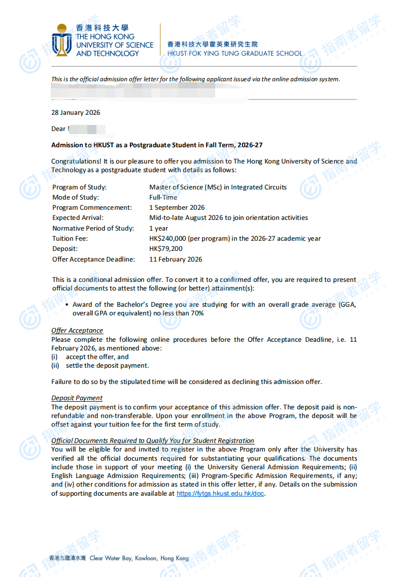 香港科技大學(xué)集成電路理學(xué)碩士研究生offer一枚