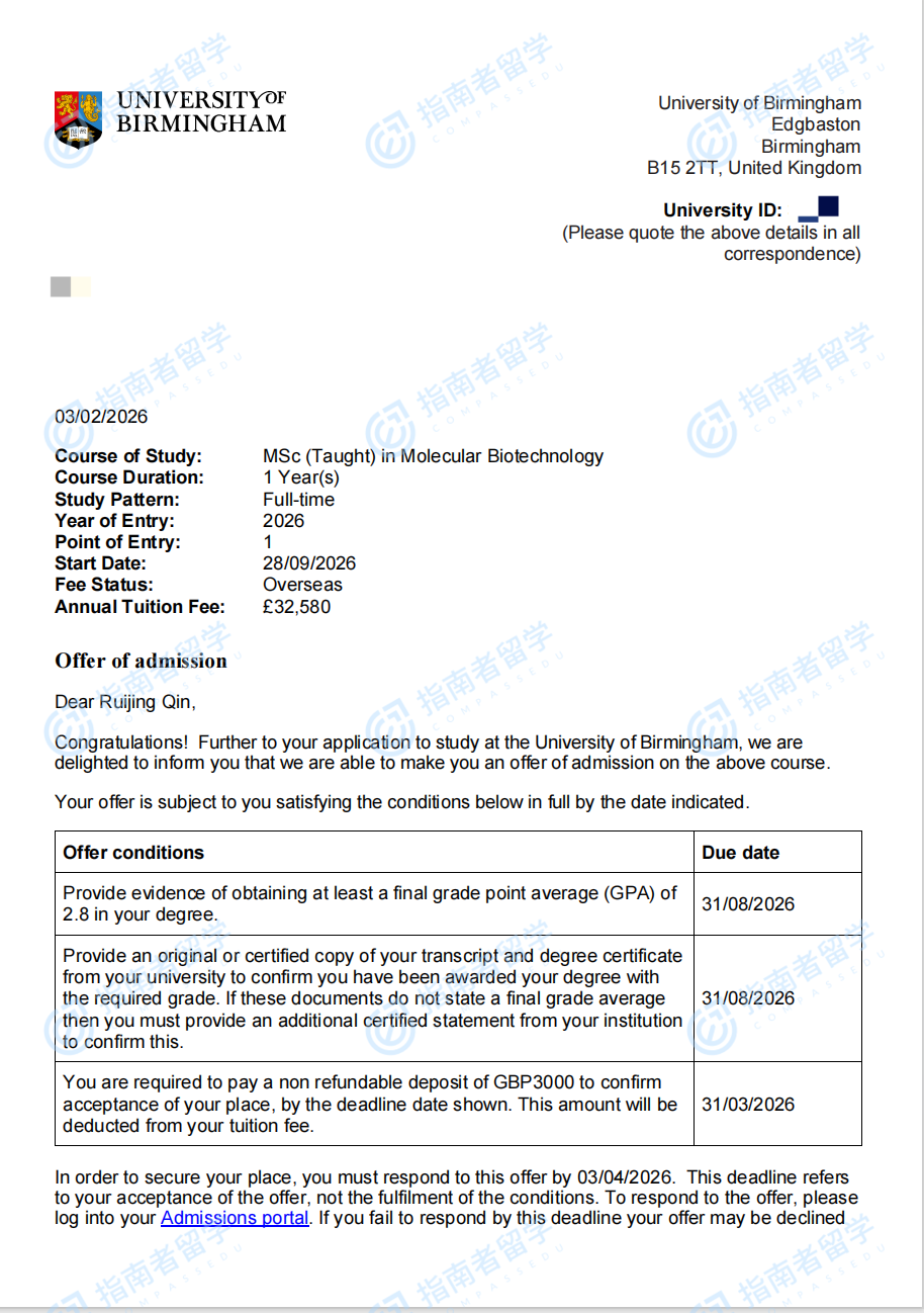 伯明翰大學(xué)分子生物技術(shù)理學(xué)碩士研究生offer一枚