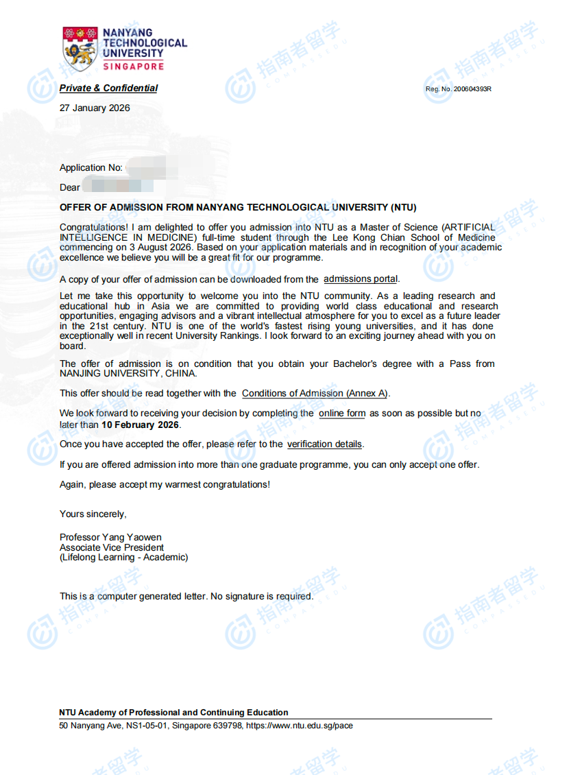 南洋理工大學(xué)醫(yī)學(xué)人工智能理學(xué)碩士研究生offer一枚