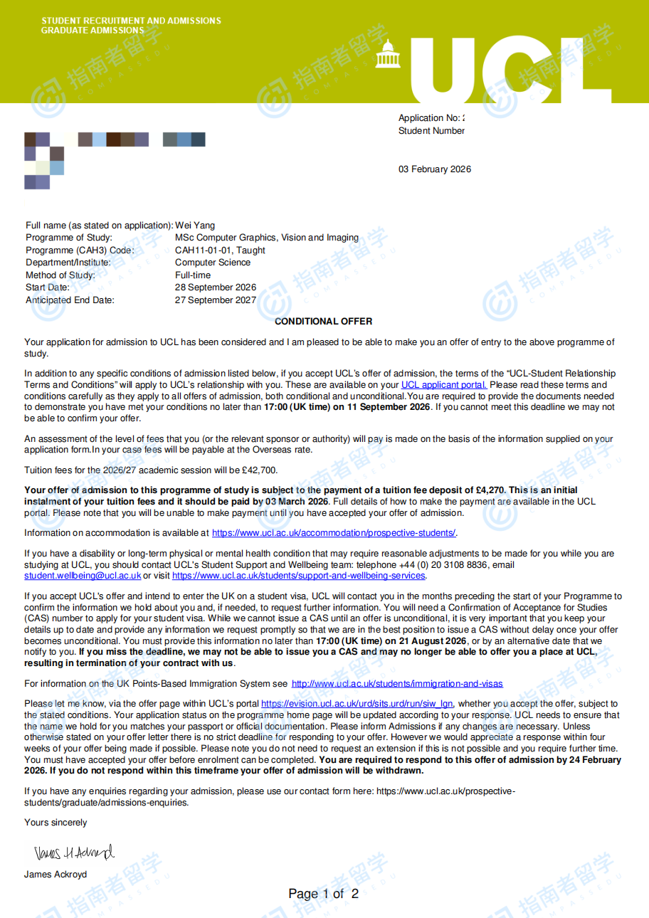 倫敦大學學院計算機繪圖、視覺與成像理學碩士研究生offer一枚