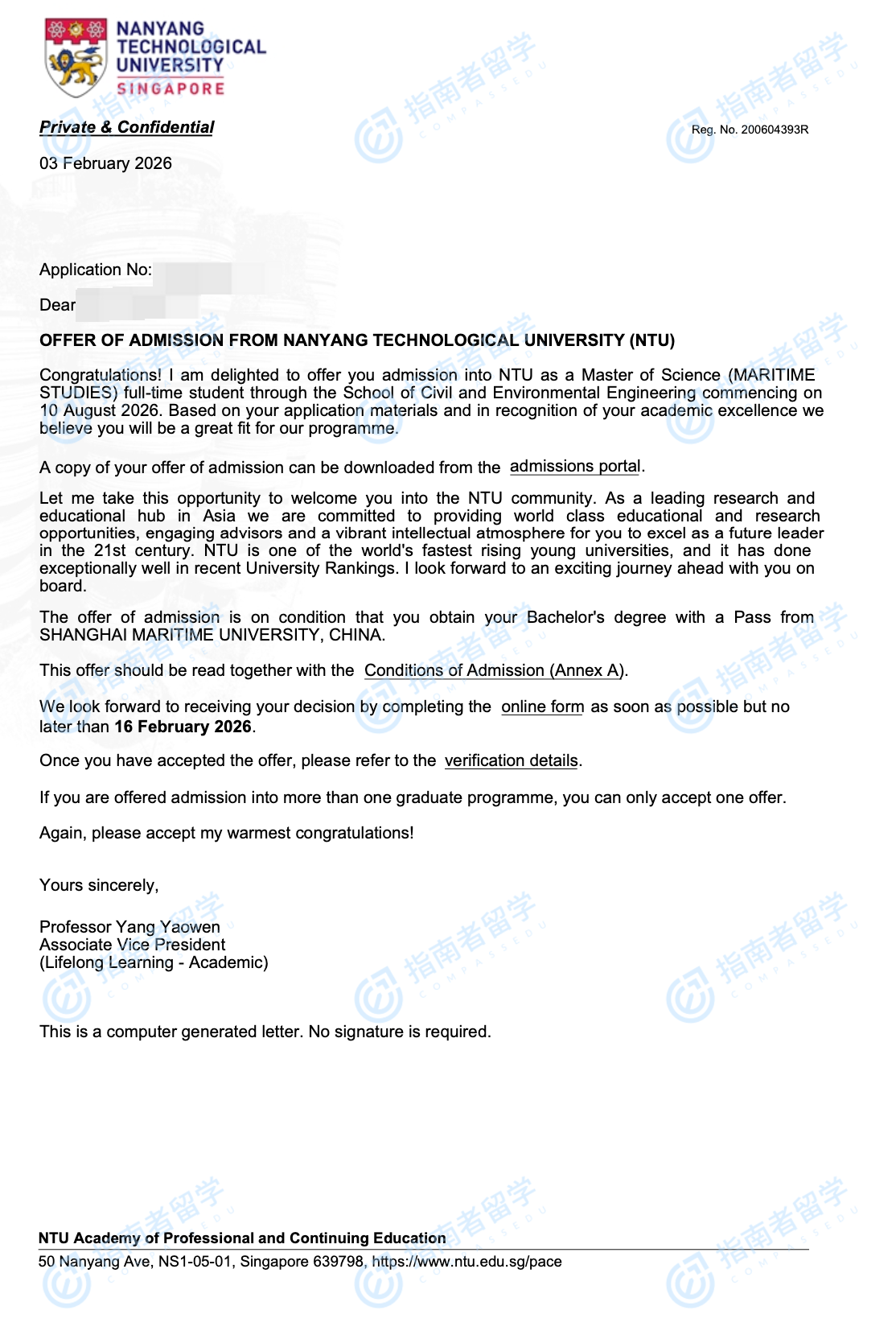 南洋理工大學海事研究理學碩士研究生offer一枚