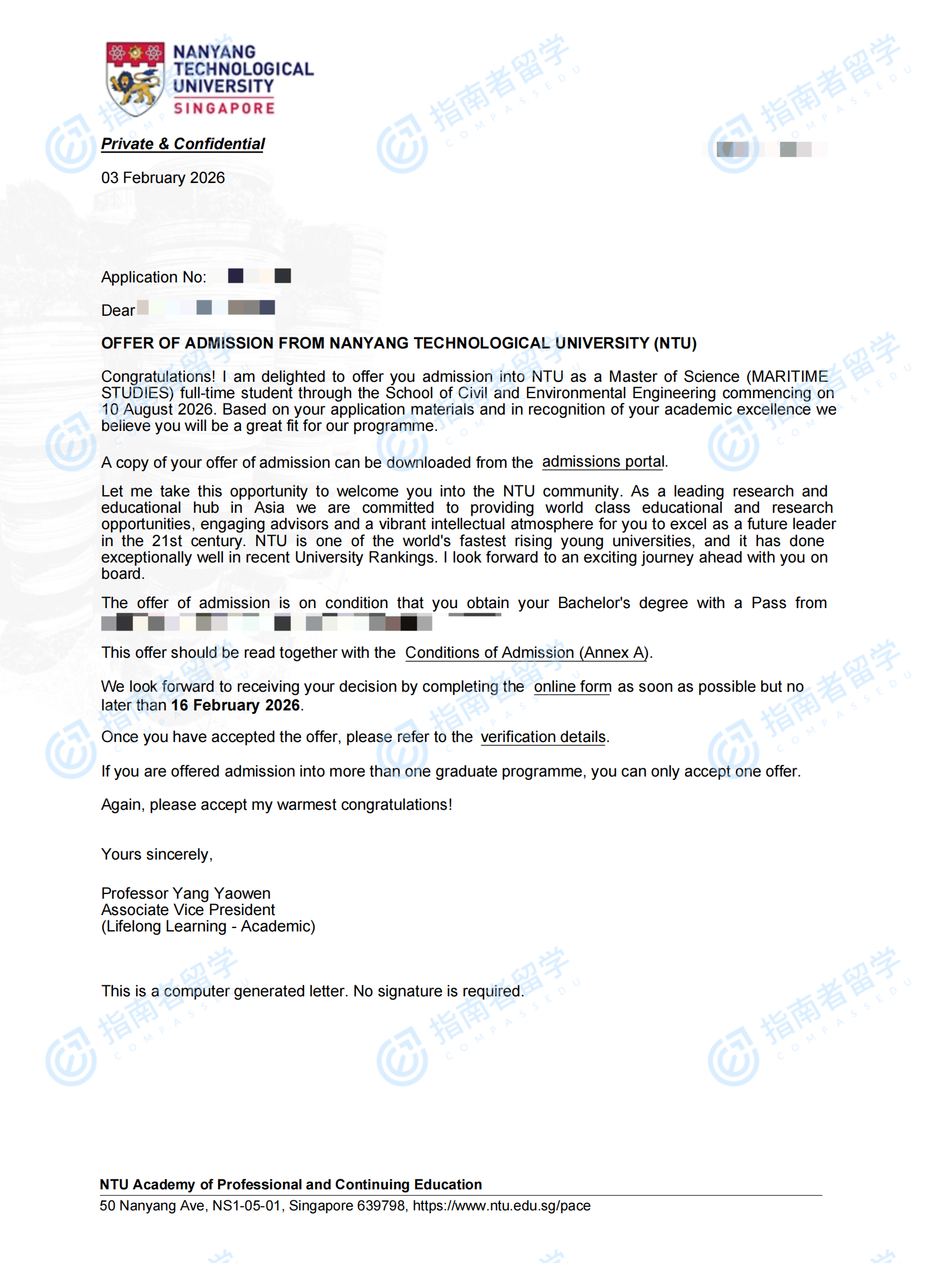 南洋理工大學(xué)海事研究理學(xué)碩士研究生offer一枚