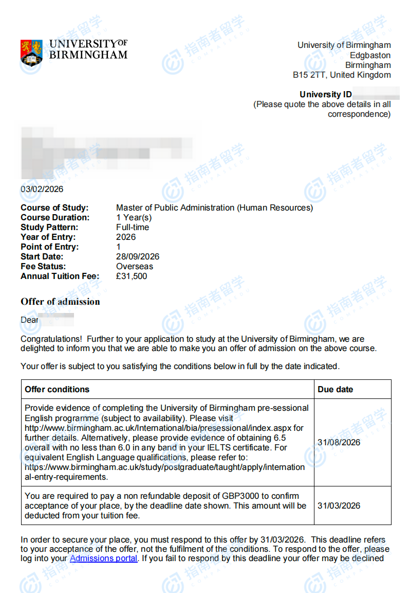 伯明翰大學(xué)公共管理碩士(人力資源)研究生offer一枚