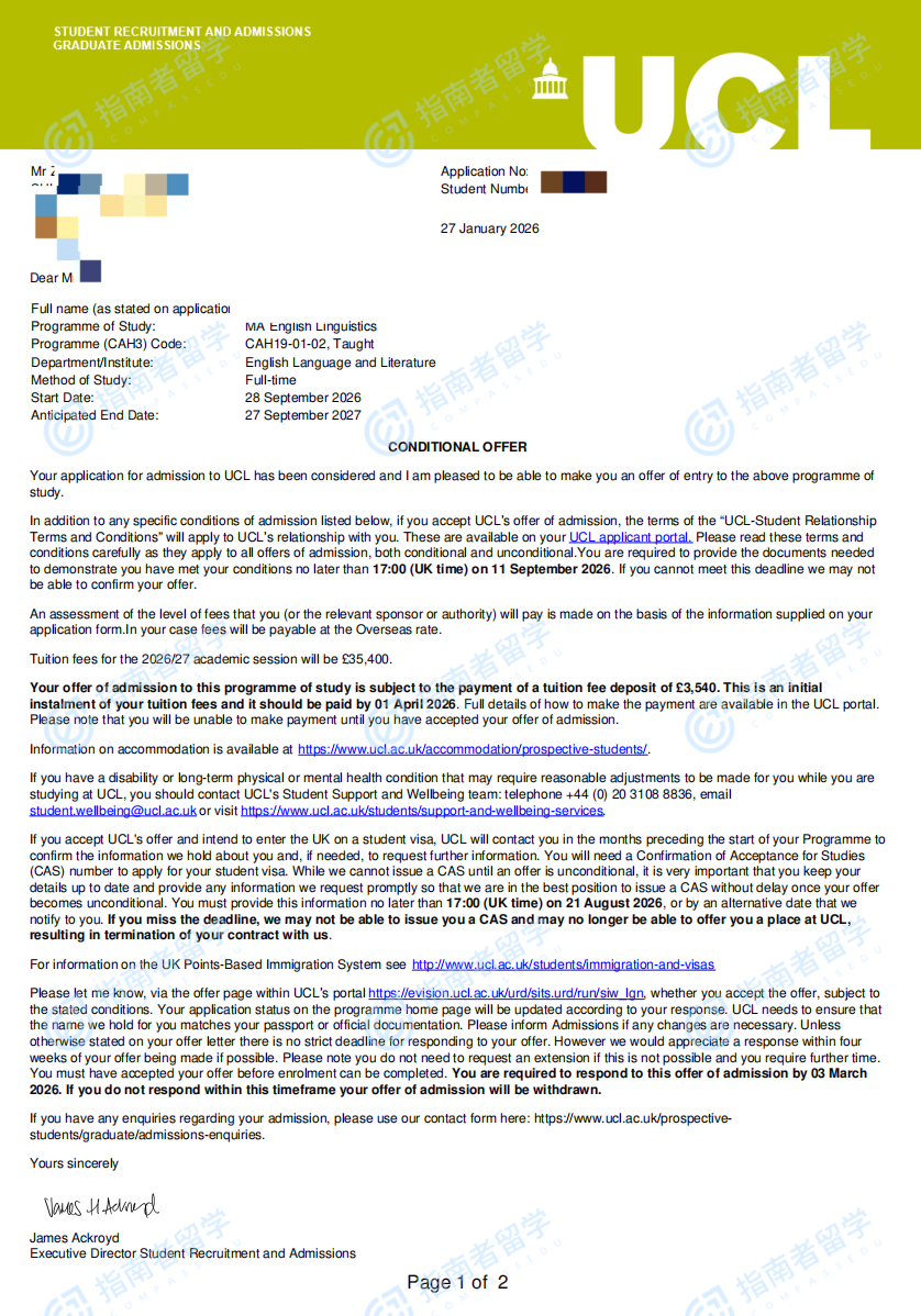 倫敦大學學院英語語言學文學碩士研究生offer一枚