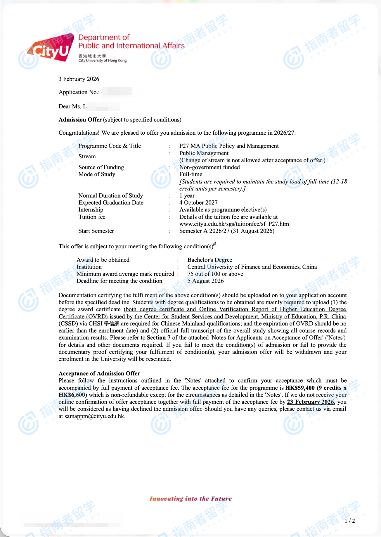 香港城市大學(xué)公共政策與管理文學(xué)碩士研究生offer一枚