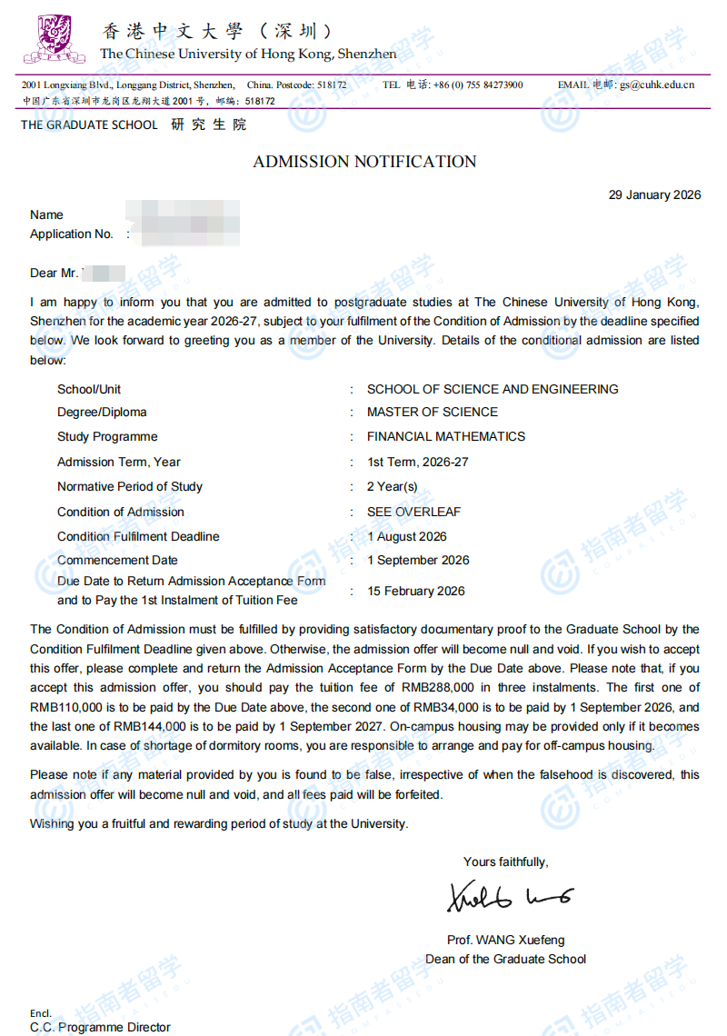 香港中文大學(xué)金融數(shù)學(xué)理學(xué)碩士(CUHK-Shenzhen)研究生offer一枚