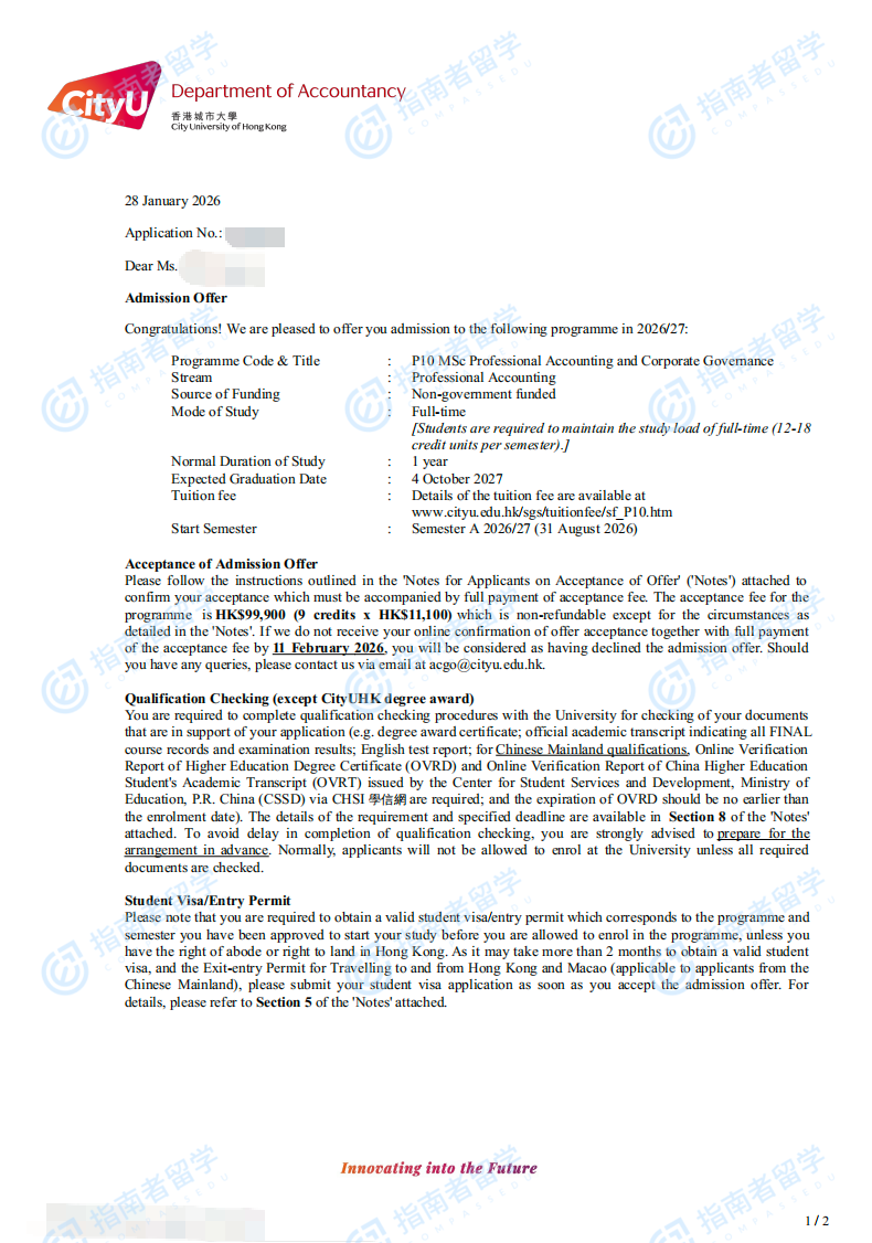 香港城市大學(xué)專業(yè)會(huì)計(jì)與企業(yè)管治理學(xué)碩士研究生offer一枚