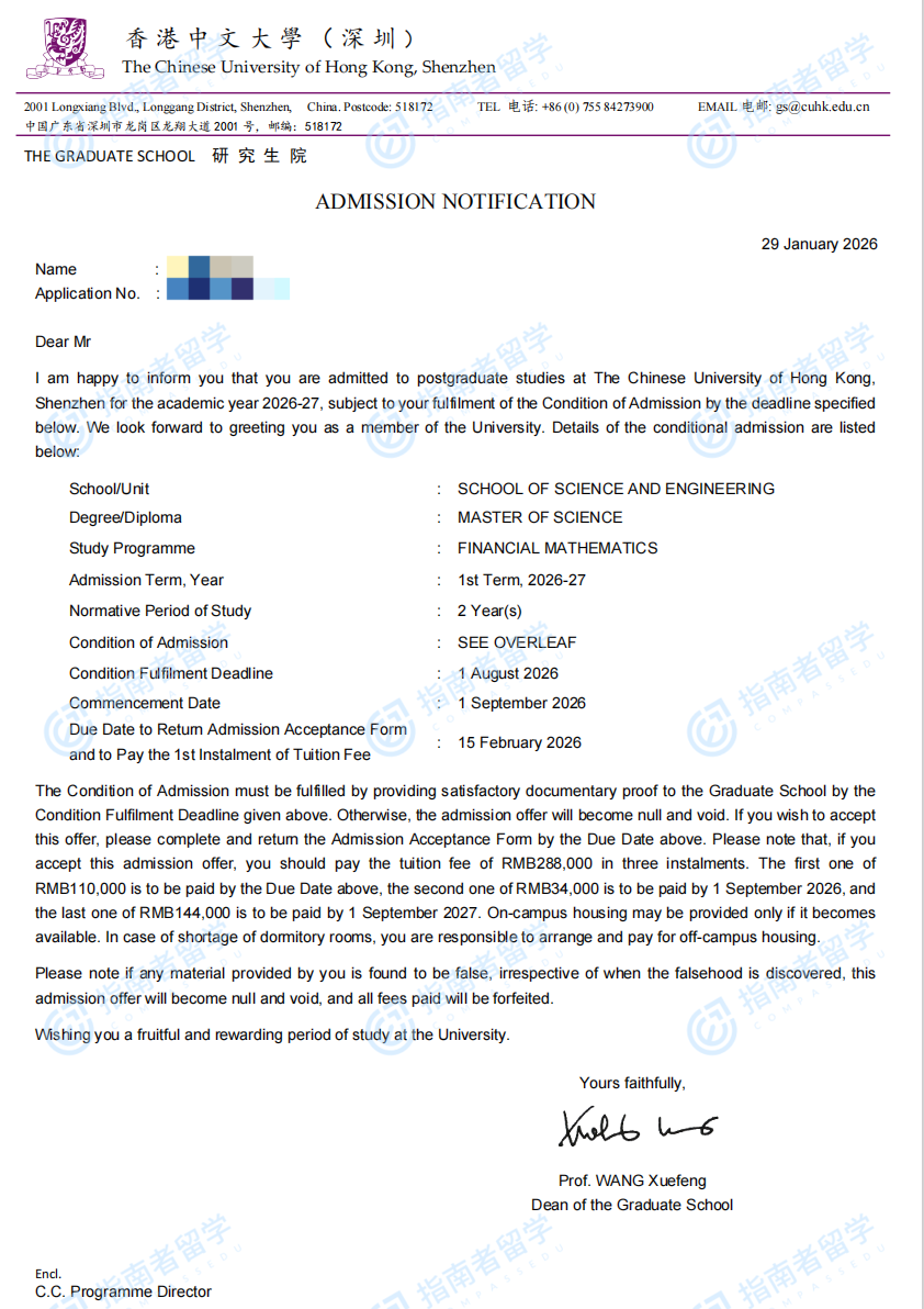 香港中文大學(xué)金融數(shù)學(xué)理學(xué)碩士(CUHK-Shenzhen)研究生offer一枚