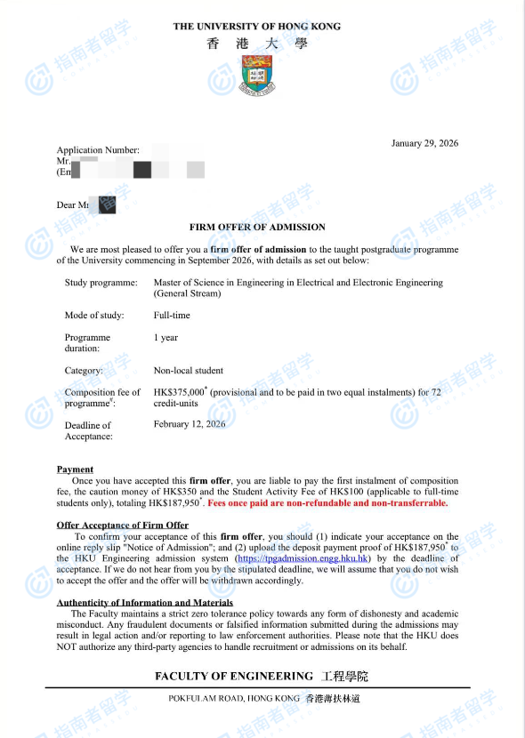香港大學(xué)電氣與電子工程(工程)理學(xué)碩士 - 常規(guī)方向研究生offer一枚
