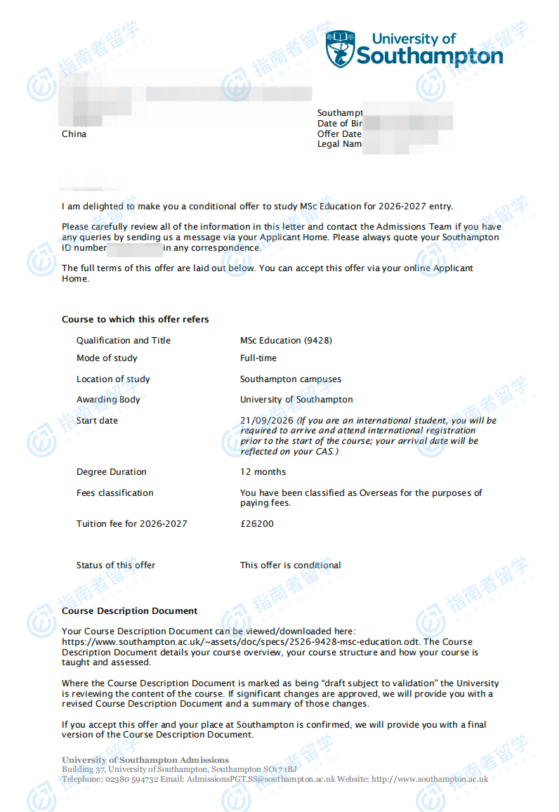 南安普頓大學(xué)教育學(xué)理學(xué)碩士研究生offer一枚