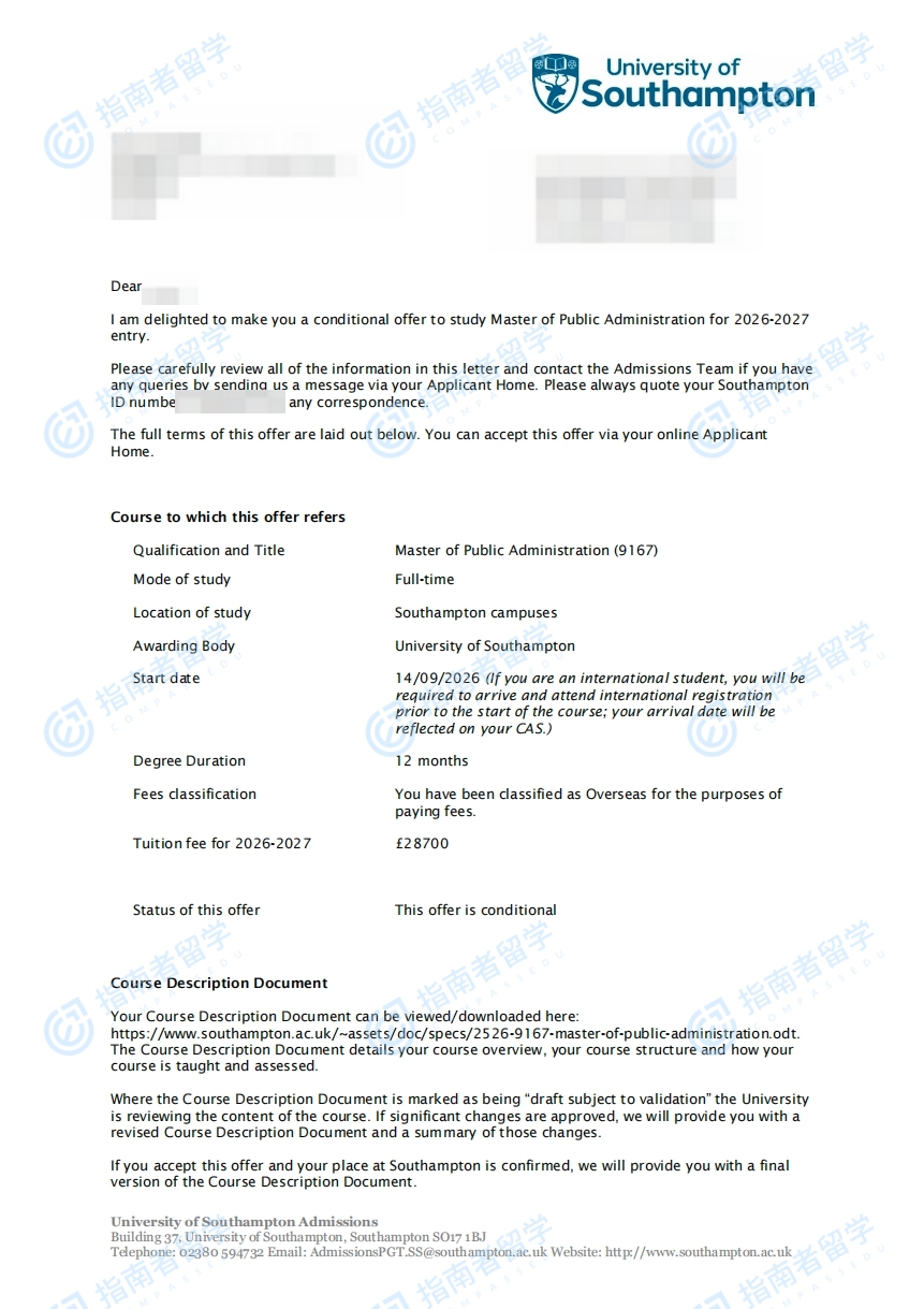 南安普頓大學(xué)公共管理碩士研究生offer一枚