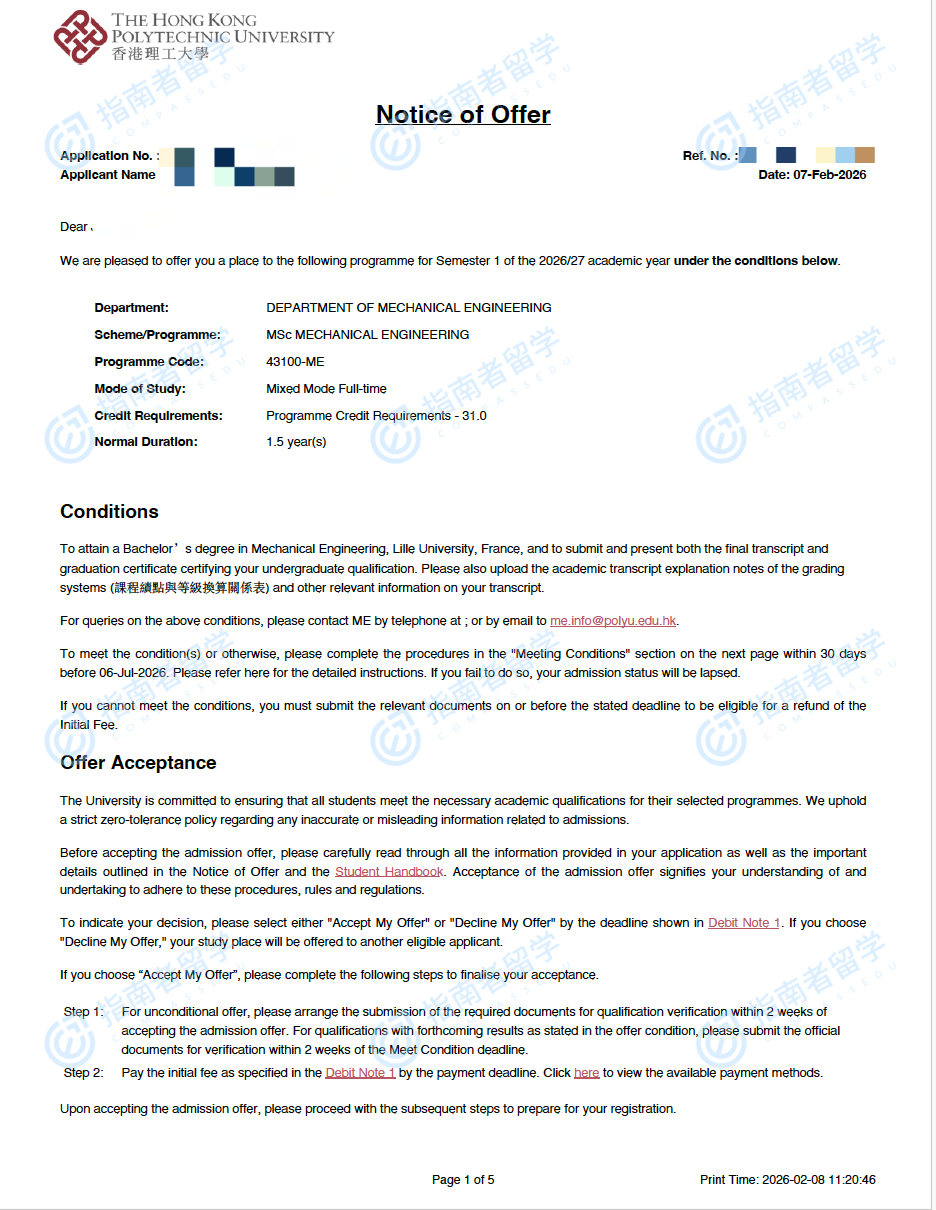 香港理工大學機械工程理學碩士研究生offer一枚