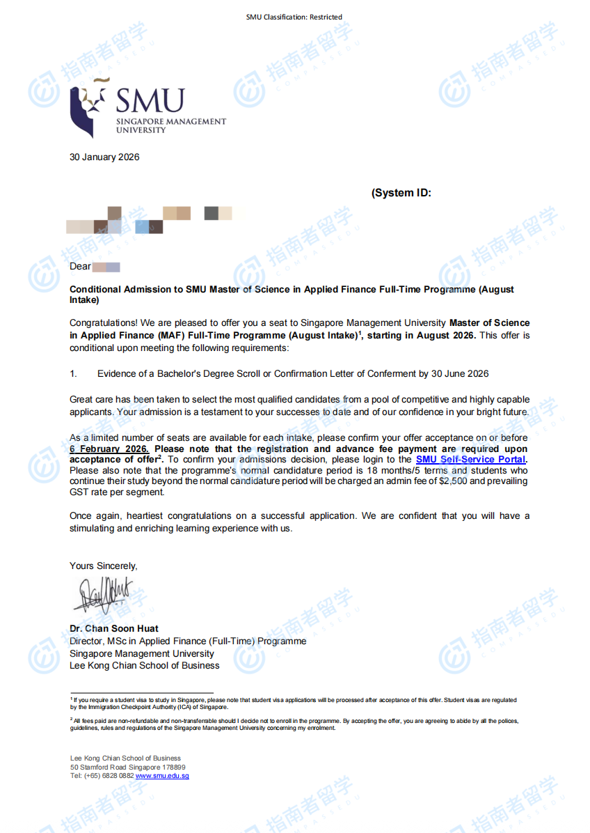 新加坡管理大學(xué)應(yīng)用金融學(xué)理學(xué)碩士研究生offer一枚