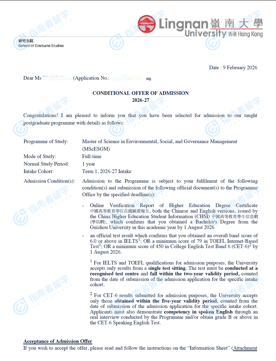 香港嶺南大學環(huán)境、社會和公司治理管理理學碩士研究生offer一枚
