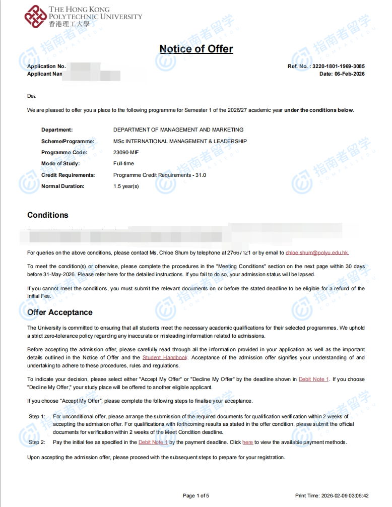 香港理工大學(xué)國際管理與領(lǐng)導(dǎo)力理學(xué)碩士研究生offer一枚