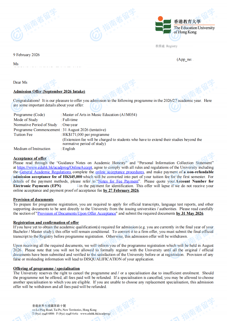 香港教育大學(xué)音樂教學(xué)文學(xué)碩士研究生offer一枚