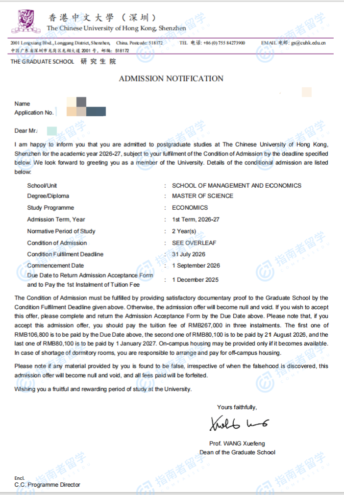 香港中文大學(xué)經(jīng)濟(jì)學(xué)理學(xué)碩士(CUHK-Shenzhen)研究生offer一枚