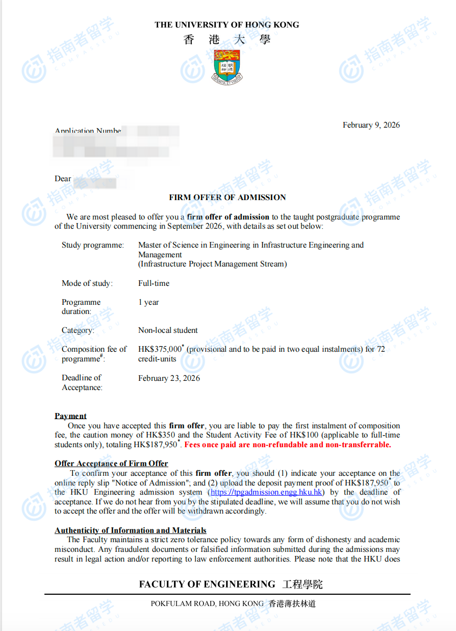 香港大學(xué)基礎(chǔ)設(shè)施工程與管理(工程)理學(xué)碩士 - 基礎(chǔ)設(shè)施項目管理方向研究生offer一枚