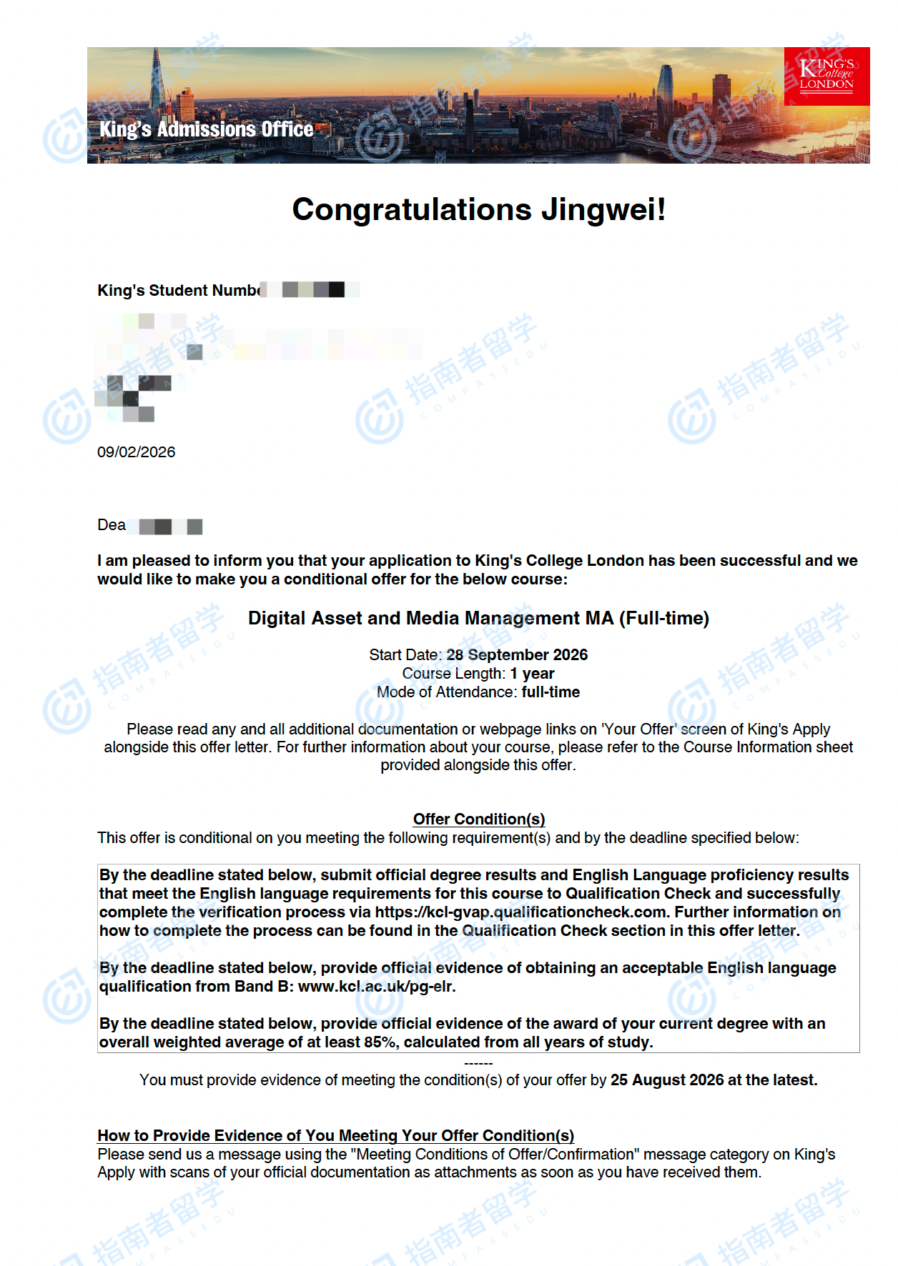 倫敦大學(xué)國王學(xué)院數(shù)字資產(chǎn)與媒體管理文學(xué)碩士研究生offer一枚
