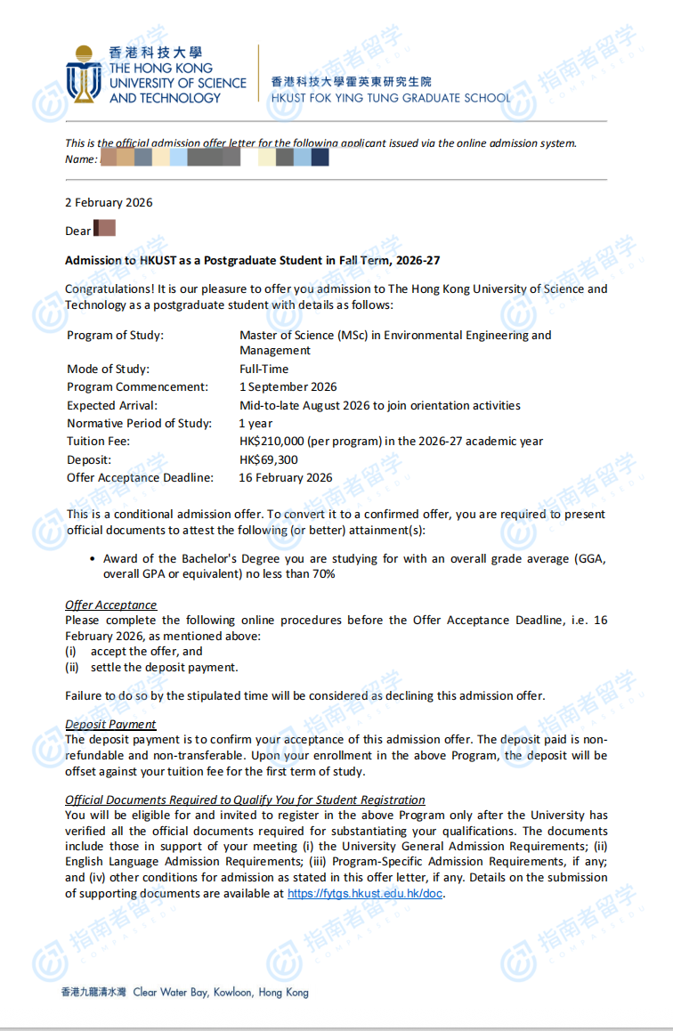 香港科技大學(xué)環(huán)境工程與管理理學(xué)碩士研究生offer一枚