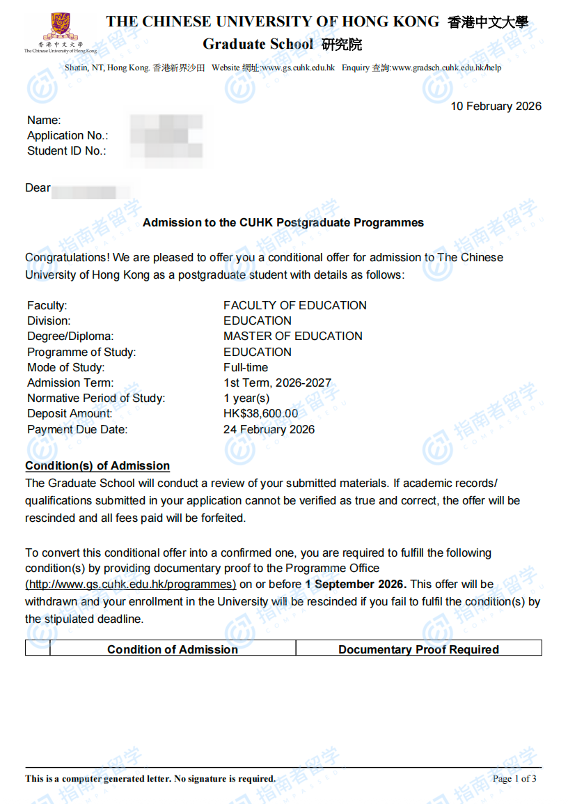香港中文大學(xué)教育學(xué)碩士(綜合課程)研究生offer一枚